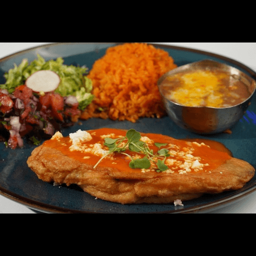Batter mild poblano pepper filled with Jack cheese & topped with red sauce & queso fresco. Served with rice & beans