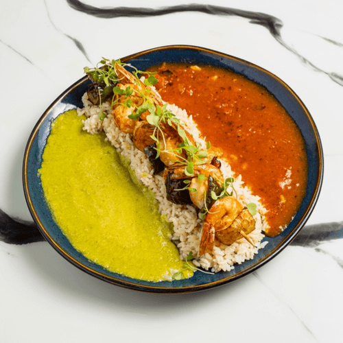 Shrimp skewer in a green tomatillo sauce & a red roasted tomato sauce, a bed of white rice & cucumber salad