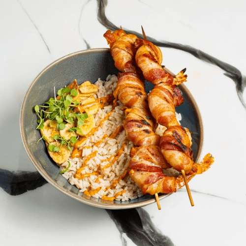 Shrimp dressed in smoked bacon, garlicky white rice, & chipotle mayo