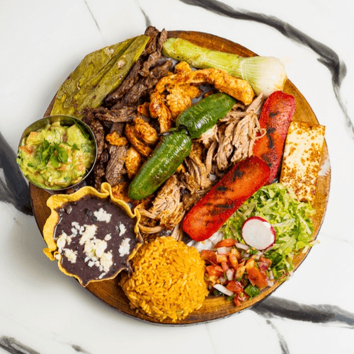 Grilled steak, chicken, pork, chorizo, Oaxaca cheese, jalapeño, rice & beans