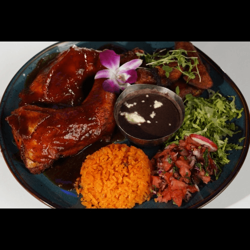 Grilled chicken in our mole, garlicky rice, beans, sesame seeds, crispy onion