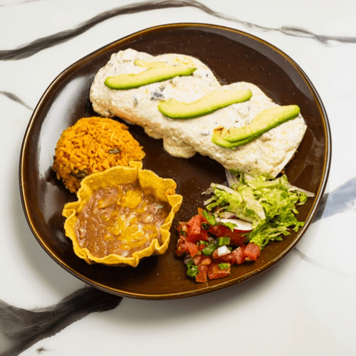 Chicken or cheese filling basted in a roasted tomatillo cream sauce, asadero cheese, rice & beans